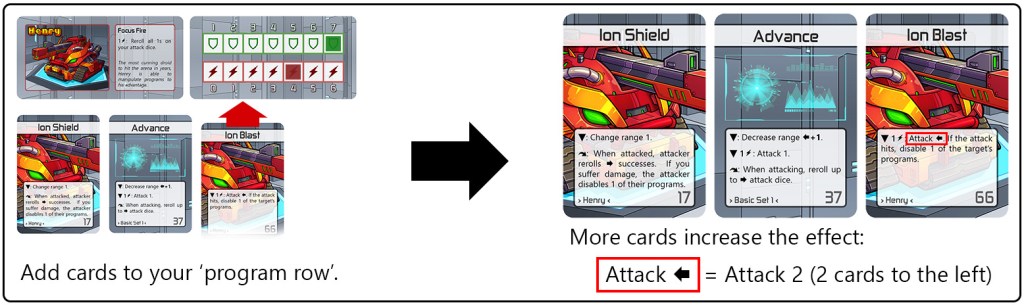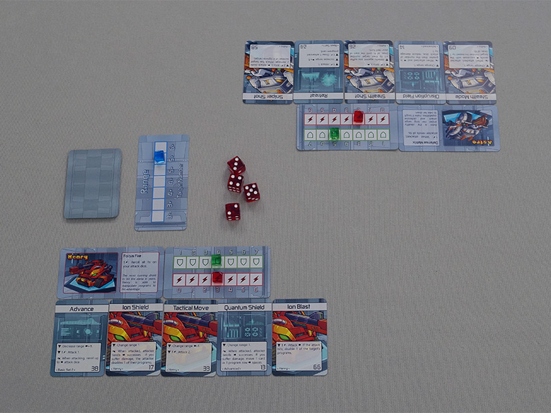I tried several variations of the range card. Initially the target number went down to 2+ but I found that it devalued defence cards – forcing a reroll when the attacker only needs 2 or more was pretty lousy odds. But with best chance at 3+ it gives a reasonable chance for a reroll to miss. Whilst making these changes I also adapted all of the ‘Shield’ cards so that if the attacker’s reroll still hit your robot, you gained some other benefit – this way it never felt like you had wasted your shield, removing any potential negative play experience resulting from bad luck.