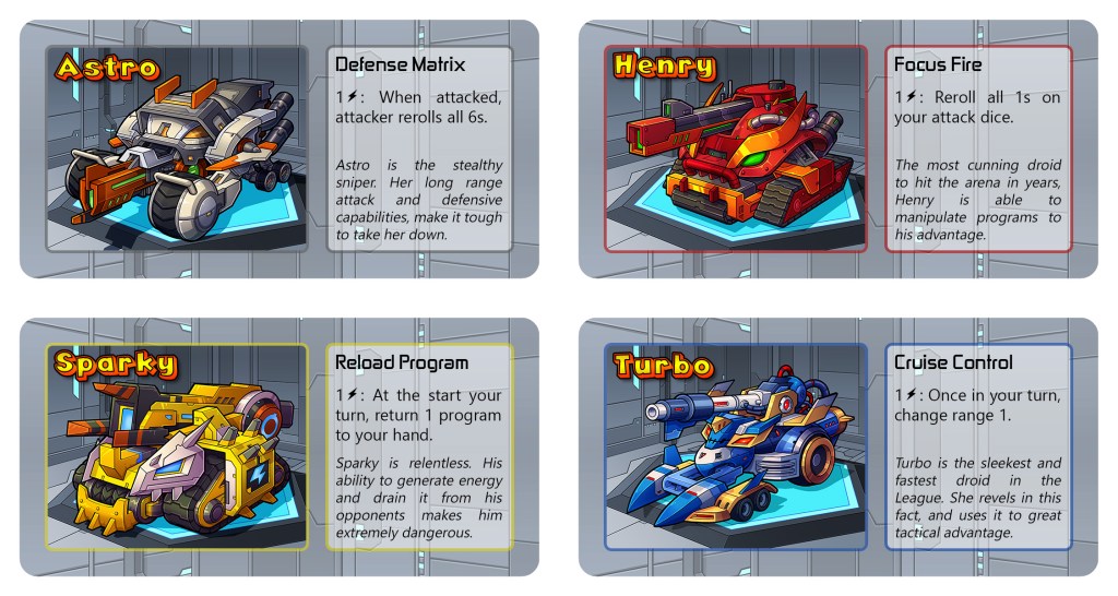 The first thing I did was limit the game to four robots (there were six in the previous big-box version). I selected them carefully so each one had its own unique abilities and play-style: Astro is defensive and works well at long range, Henry is better at offense and manipulates cards in play, Sparky has mastery over energy, and Turbo is all about speed & movement.
