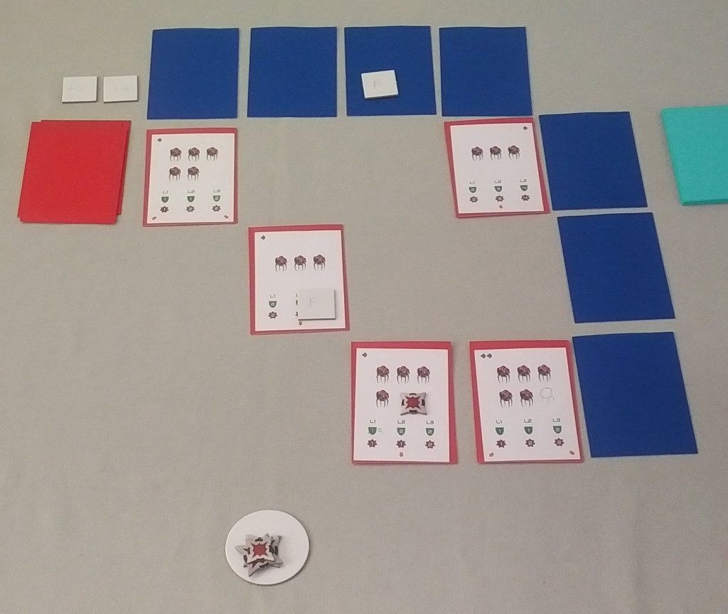 Now to the row cards. As there were three row cards and three levels in the game, using them as a level marker was a no brainer – all I needed to do was number the cards and create a token to mark the level. Also, because the enemy decks and upgrade decks are level based, by placing these decks alongside the row cards, it makes it clear which deck belongs to which level.