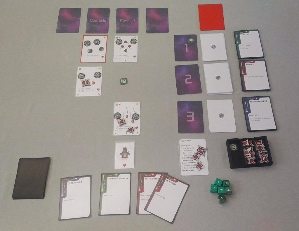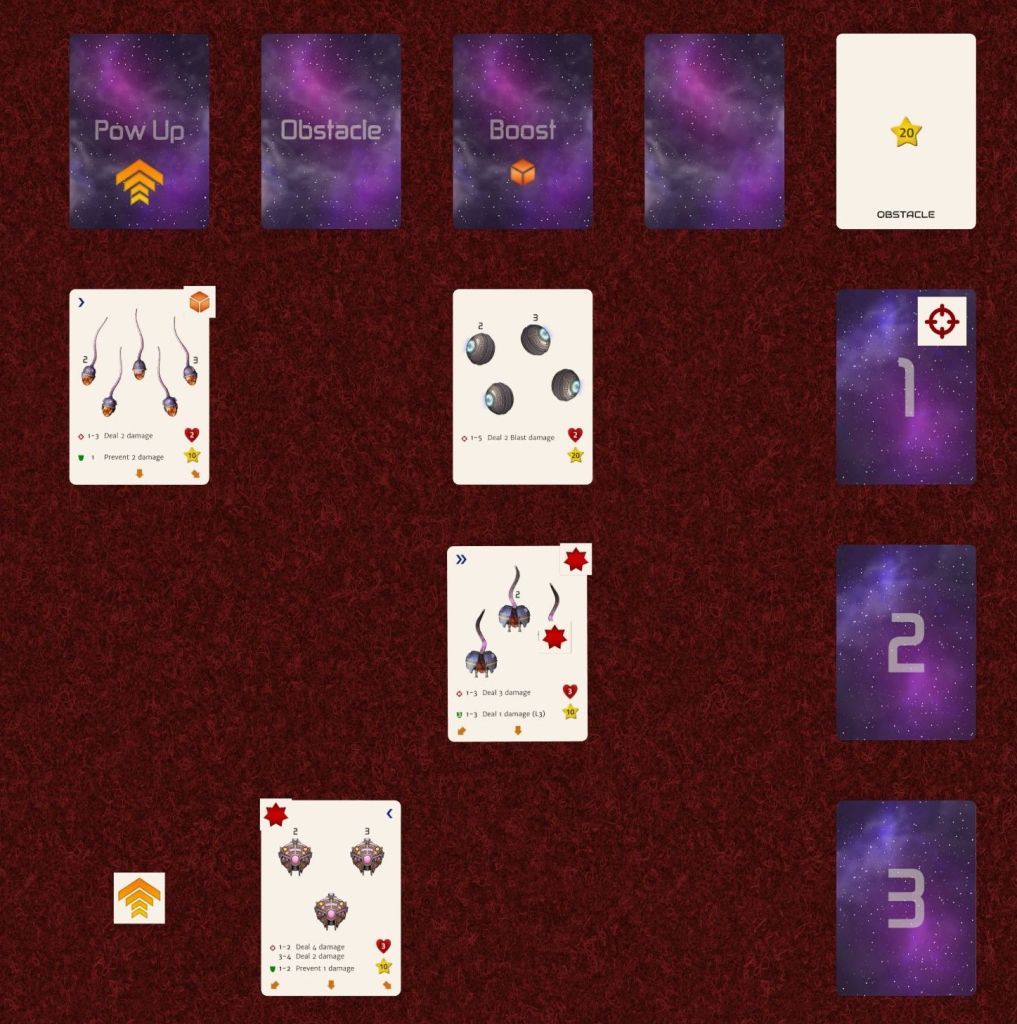 Plenty of shoot ‘em ups have asteroids and other obstacles that the player has to avoid or shoot. This was a must have, so every time the obstacle event is revealed, a card is drawn from an obstacle deck and deployed in the grid. Obstacles don’t shoot, but they can block shots to the enemy cards and damage the player if the two collide. On the plus side, they do award bonus points when destroyed.