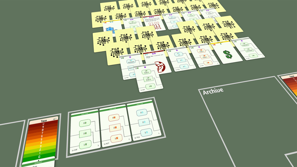 On your turn you play 3 Code cards. Each card has a top, middle, and bottom command. Each command is more powerful than the one above it, and you can only use the top command of the first card, the middle command of the second card, and the bottom command of the last card.